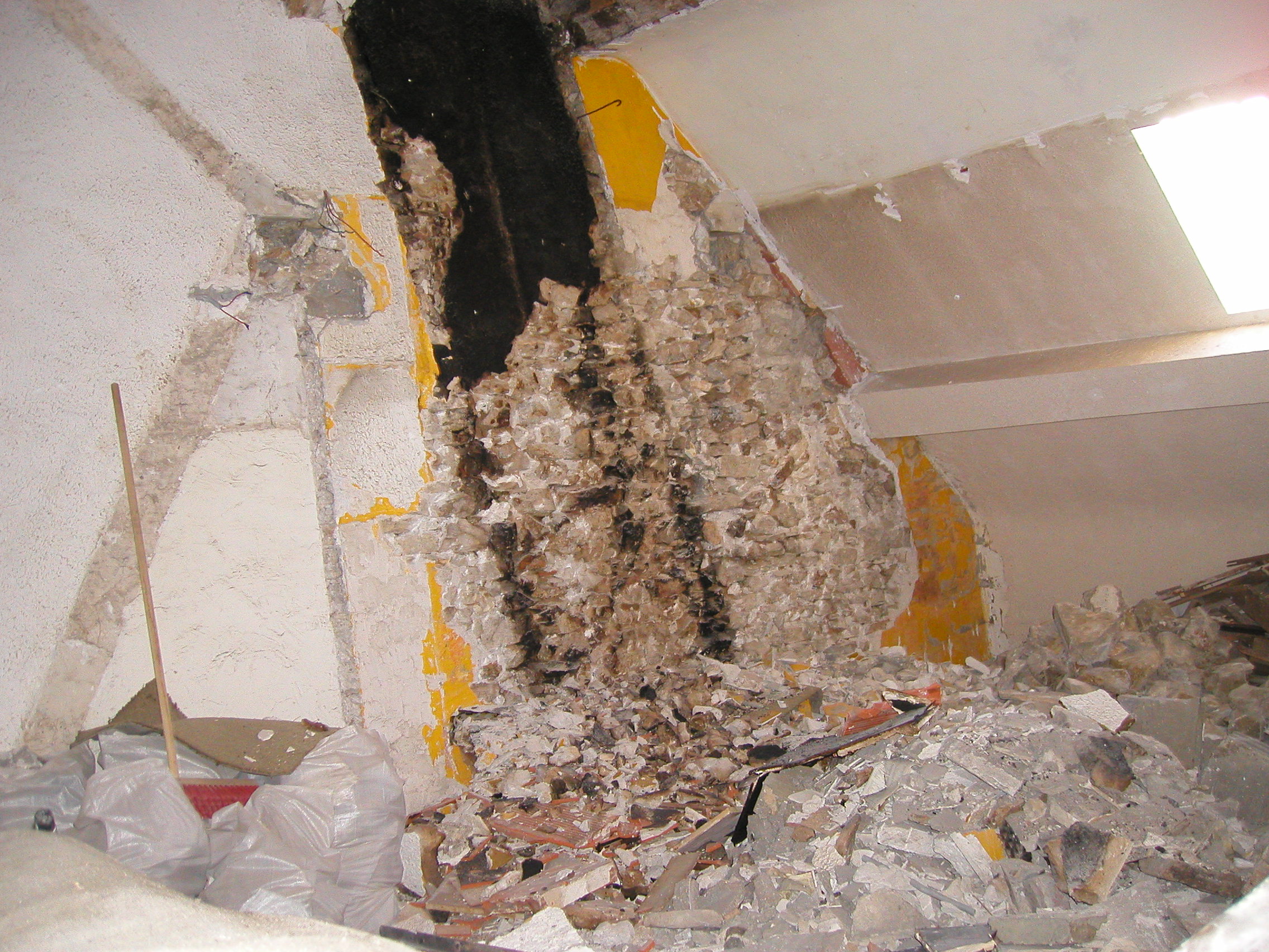 Mise a nu des pierres au niveau de l'ancienne cheminée: le conduit etait a même le mur et les pierres incrustée de suif