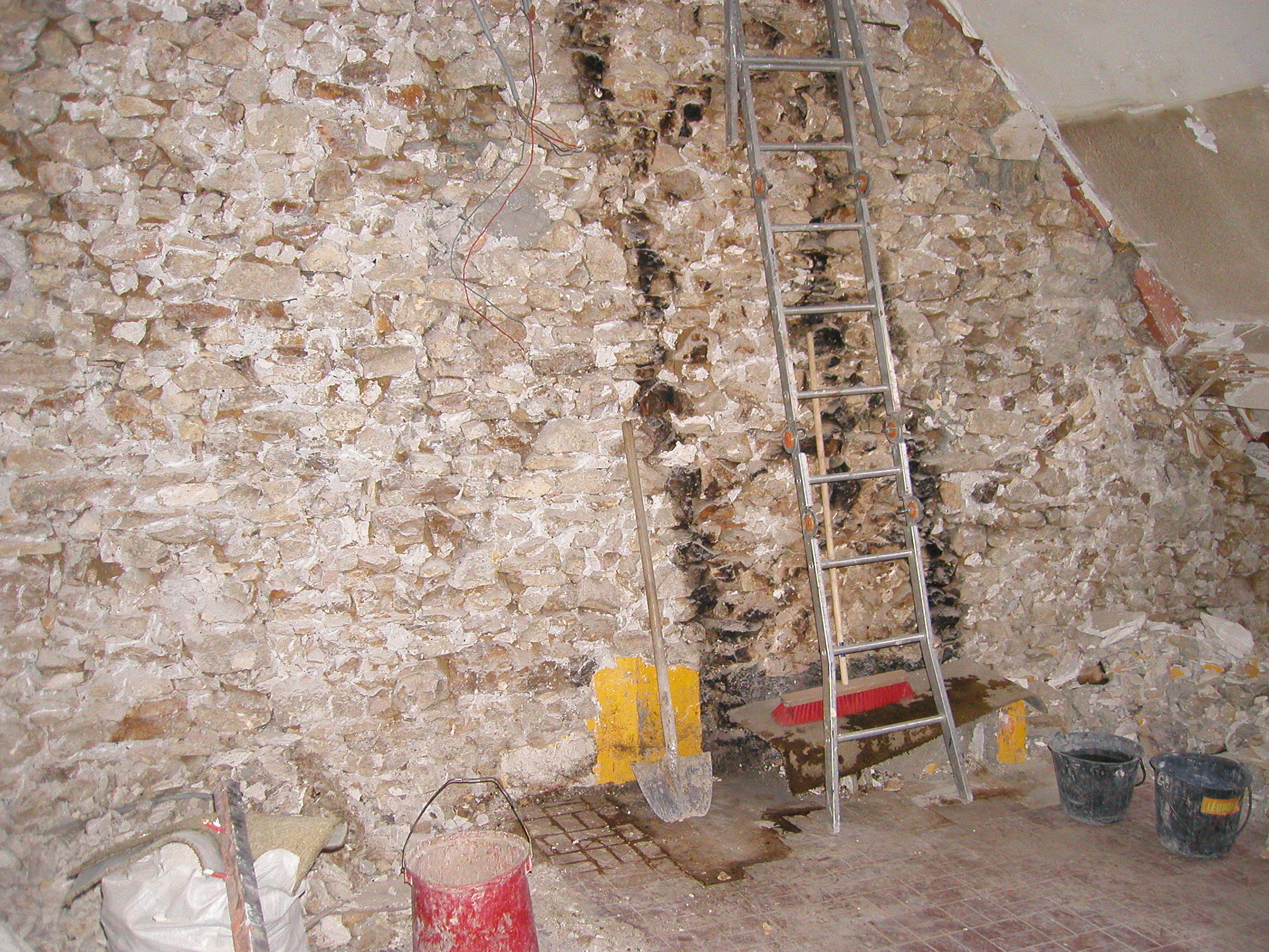 Mise a nu des pierres au niveau de l'ancienne cheminée: le conduit etait a même le mur et les pierres incrustée de suif