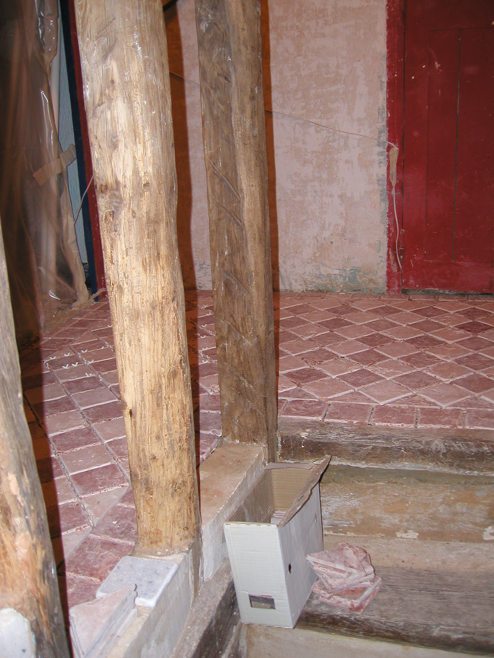 Pause des carreaux de marbre. Le platre entre les poutres a été retiré pour augmenter la lumiere