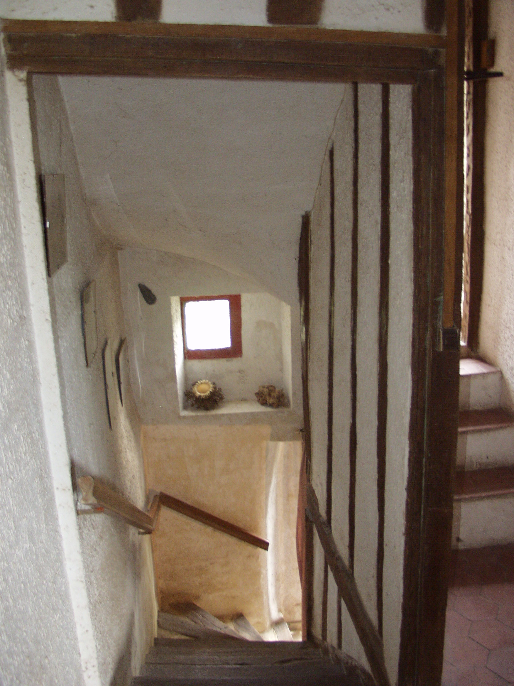 Escalier à l'achat: le mur sur la droite est fermé, le sol est en tomettes et le mur en crépi