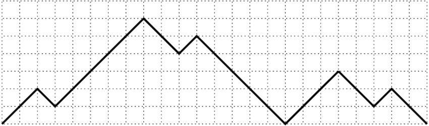 Les sommes cumulées du tableau ci-dessus représentent la hauteur atteinte par le chemin de Dyck après chaque $b$.