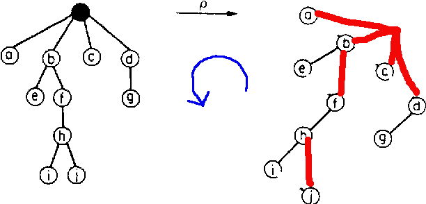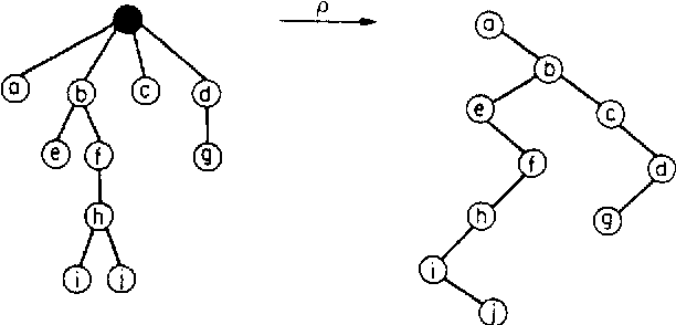 La réponse est oui : c'est la rotation de Knuth. Elle construit un arbre binaire incomplet (c'est à dire, sans ses feuilles) $B=\rho(A)$ à $n-1$ noeuds. Il aura donc $n$ feuilles quand on les aura rajoutées. Pour le calculer, on étiquette tous les noeuds de l'arbre ordonné $A$, sauf la racine. Dans l'arbre binaire $B$, le sommet $j$ est le fils gauche de $i$ si c'est son fils le plus à gauche dans $A$, et $j$ est le fils droit de $i$ si dans $A$, c'est son frère immédiatement à droite :