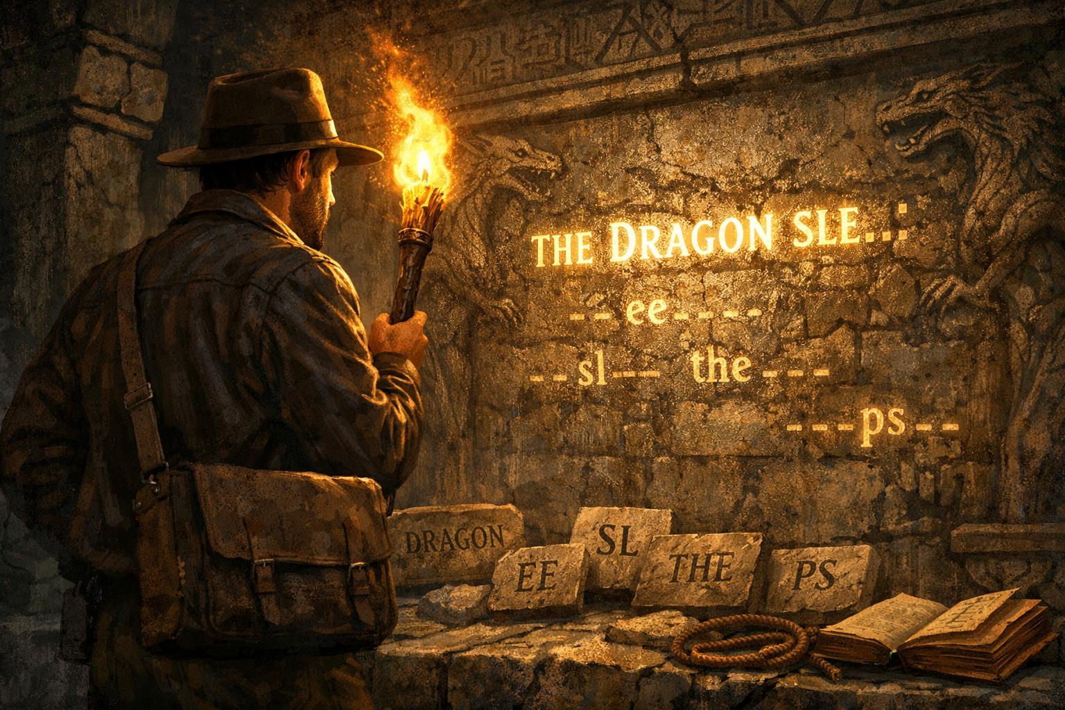 Dans un ancien temple, une porte magique protège l’accès de la bibliothèque oubliée. Pour l’ouvrir, il faut retrouver un mot secret gravé en lettres d’or sur la pierre. Malheureusement, au fil du temps, ces lettres sont devenues invisibles.