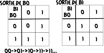 - Il ne reste plus qu'à calculer la sortie pour chaque état. Dans notre cas, la sortie correspond exactement au codage des états. Il n'y a donc rien à faire.