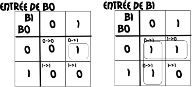 - Il suffit alors de simplifier par la méthode de Karnaugh pour trouver quelles sont les entrées de nos deux bascules.