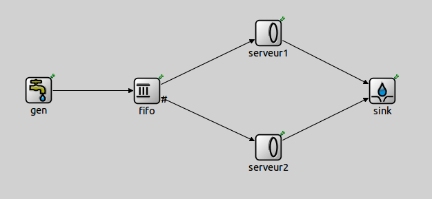 2. Deux modules serveurs (serveur1 et serveur2). Le temps de service de chaque serveur suit une loi exponentielle de paramètre μ jobs/s.