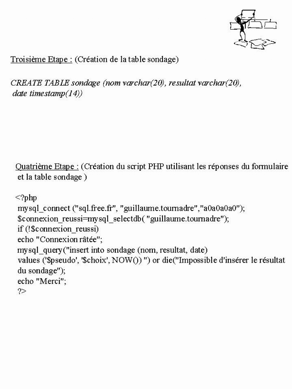 La troisime partie consiste à créer une table mySQL. Pour plus de étails sur les comptes free.fr : http://support.free.fr/web/index3.html ou sur mySQL : la documentation en français