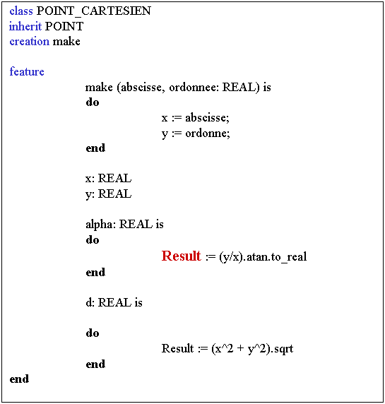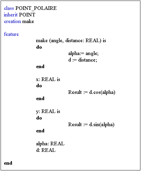 Les classes POINT_CARTESIEN et POINT_POLAIRE implantent toutes les primitives retardées de POINT et sont donc concrètes et instanciables.