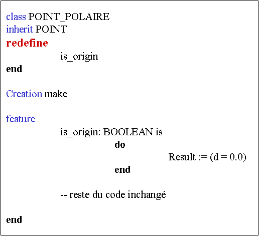 Ces deux classes héritent de la méthode is_origin, définie dans POINT, sans changer son implantation. Celle_ci a pu être définie dans POINT, puisque les types des variables x et y étaient connus, bien que 1'implantation ne l'était pas encore. Ces deux classes disposent donc d'une routine is_origin, dont le code a été défini et implanté dans POINT, sans surcoût aucun, au lieu d'avoir eu à les implanter elles_mêmes. Bien entendu, sur ce petit exemple, le gain en termes de lignes de code économisées est faible, mais sur des applications de plusieurs centaines de classes, ce type d'héritage permet de réutiliser un volume important de code, ce qui facilite fortement le développement et le débogage. C'est la principale justification de l'héritage et de bonnes bibliothèques en font un usage judicieux.
