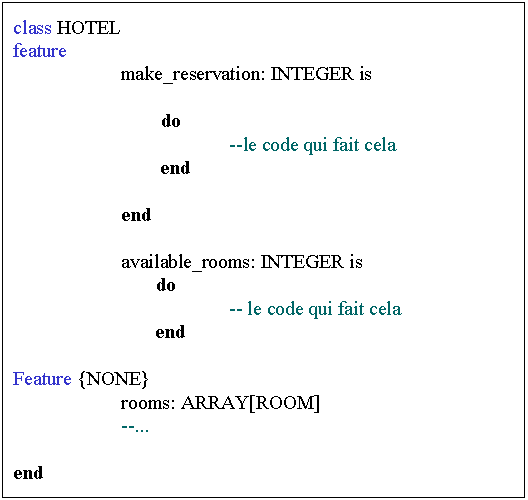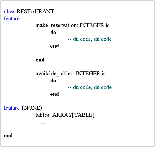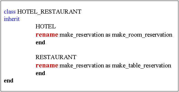 Ainsi, HOTEL_RESTAURANT réutilise non seulement l'interface (profils des routines et leurs assertions) mais également le code des ses deux ancêtres, sans aucune modification. De simples renommages ont été effectués pour éviter une collision sur le nom 'make reservation' et différencier la réservation d'une table de la réservation d'une chambre.