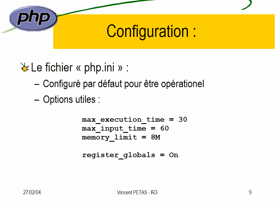Le fichier "php.ini" est commun pour un sereveur PHP fonctionnant sous Linux ou sous Windows. Il est lu par PHP au démarrage. Si vous avez compilé PHP en module, le fichier n'est lu qu'une seule fois, au lancement du démon HTTP . Pour la version CGI le fichier est lu à chaque invocation. La localisation par défaut du php.ini est une option de compilation (voir FAQ ), mais elle peut être changée pour les versions CGI et CLI avec l'option de ligne de commande -c : voyez le chapitre sur l'utilisation de PHP en ligne de commande . Vous pouvez aussi utiliser la variable d'environnement PHPRC pour indiquer des chemins supplémentaires pour rechercher le fichier php.ini . Toutes les directives PHP ne sont pas documentées ci-dessous. Pour une liste de toutes les directives, lisez le php.ini , qui est très bien documenté. Par défaut, il est configuré pour être tout de suite opérationnel, cependant les options les plus pertinentes sont :