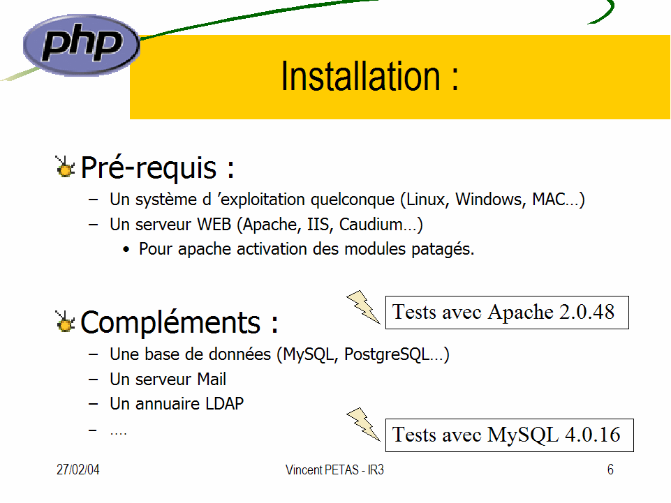 Pour pouvoir faire fonctionner un serveur PHP, il est nécessaire d'avoir une machine avec un système d'exploitation quelconque (Linux, Windows, HP-UX...) et un serveur WEB quelconque (Apache, IIS, Caudium...). Afin d'utiliser au mieux le serveur PHP, l'activation des modules avec Apache est préférable