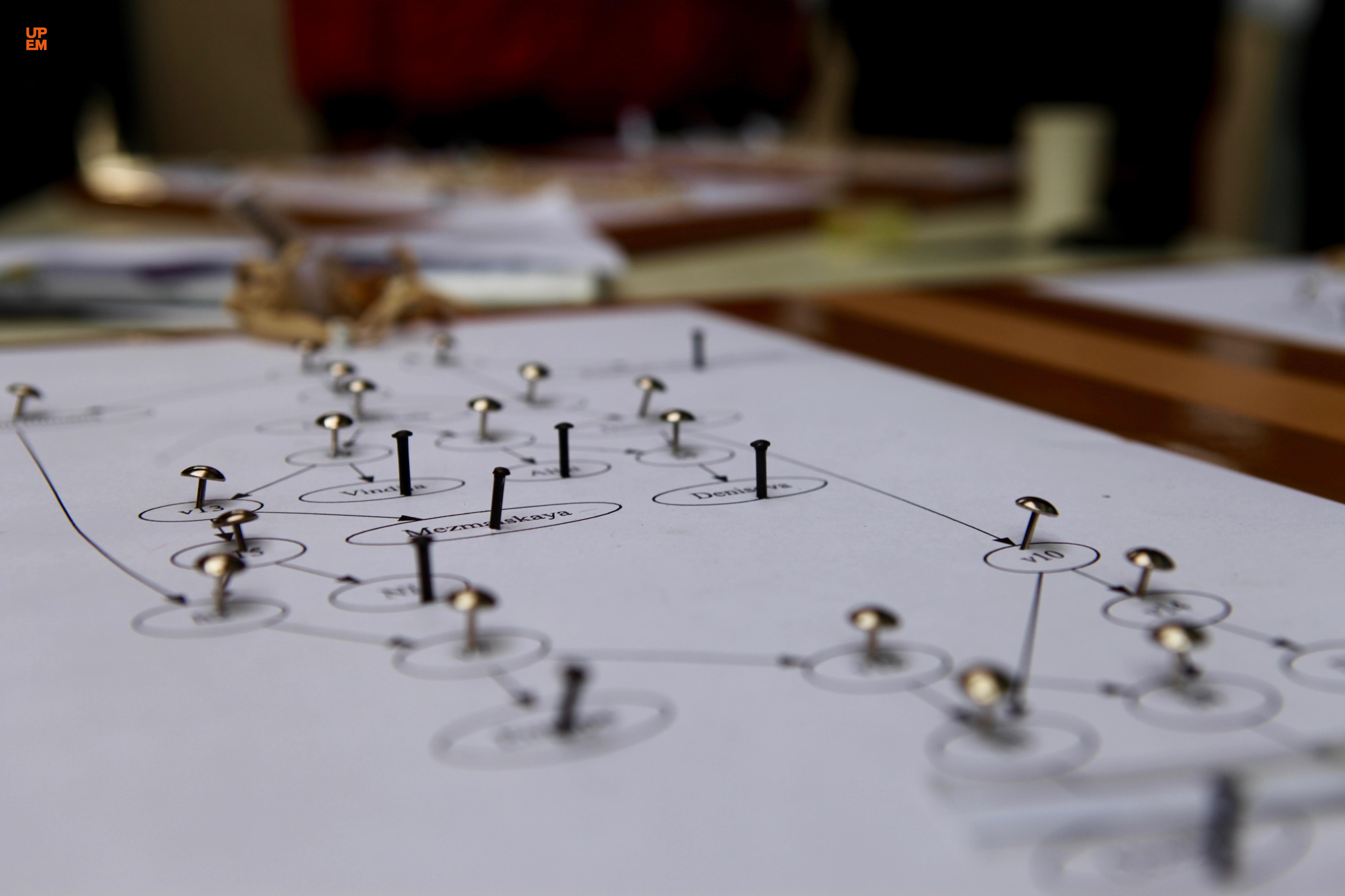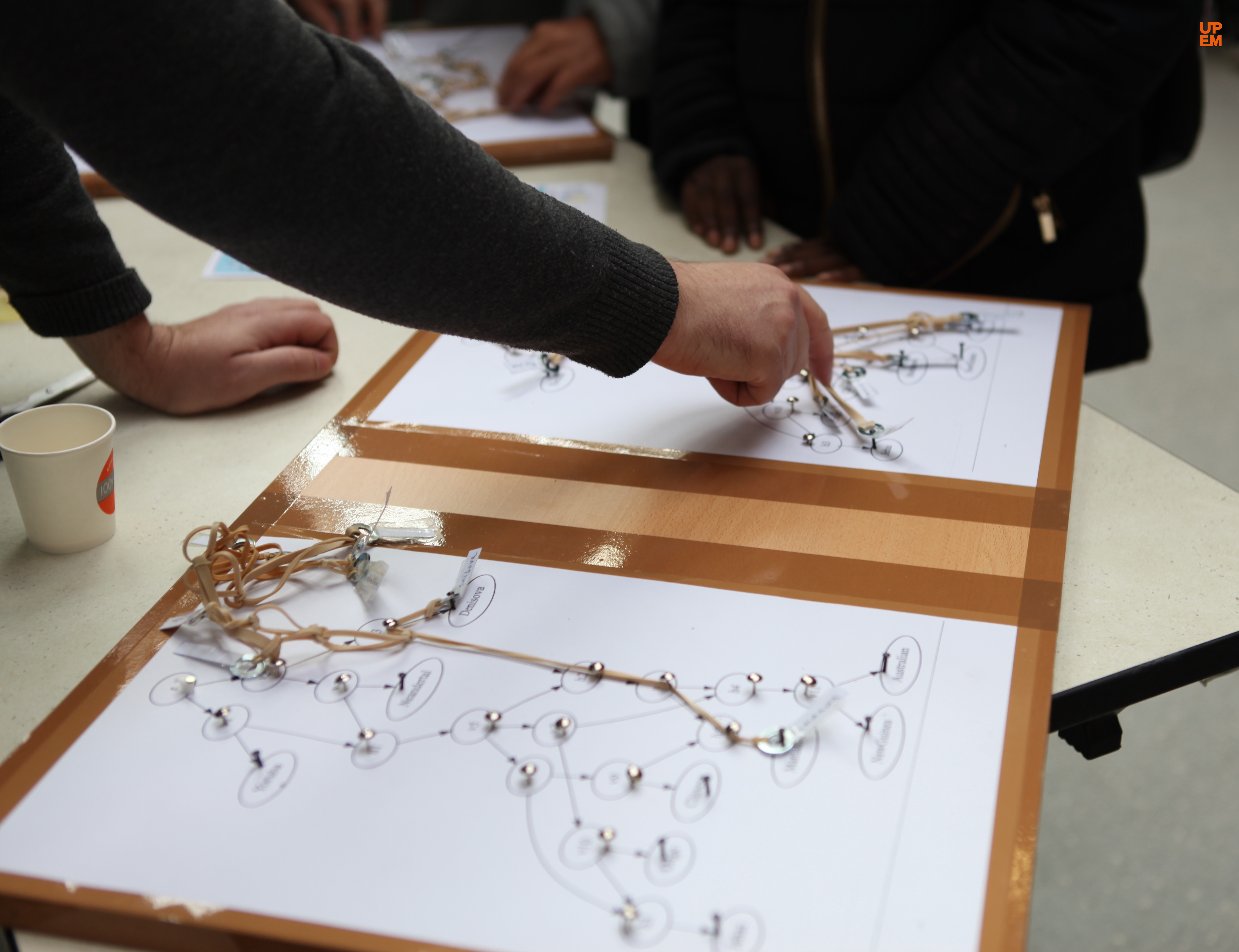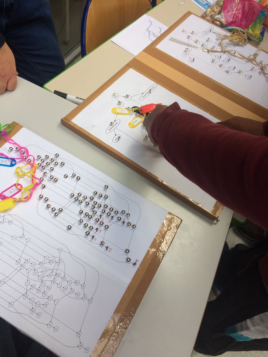Le principe de cet atelier est d'arriver à accrocher un arbre constitué d'élastiques sur un panneau représentant un réseau phylogénétique, avec un