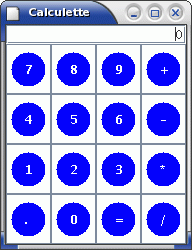 Modifier le programme précédent pour que les touches de la calculatrice apparaissent comme des ronds bleus et que le texte dans la fenêtre soit justifié à droite: