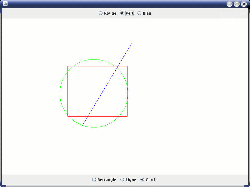 Écrire une énumération Forme dont les valeurs sont LIGNE, RECTANGLE et CERCLE. Chaque forme possède une méthode Drawable getForme(int x0, int y0, int x1, int y1, Color couleur) qui retourne l'objet correspondant.